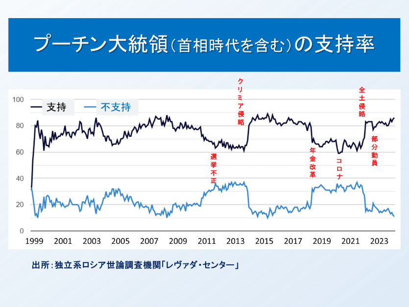 プーチン大統領は、自らの権力維持の観点から、戦争を政治的に利用している側面もある。これまでも、自らの支持率が低下した際に、クリミア侵略(2014年)や全土侵略(2022年)に踏み切り、その直後に支持率が大きく反転した。ロシアの著名な学者であるカーネギー国際平和財団のガブエフ氏は、プーチン大統領は「西側との対立」をロシアの行動様式の基本原理に据え、既に「反西側」はロシアの国内メカニズムの一部として定着しているとして、将来的ないかなるウクライナ停戦もこの国内メカニズムを覆すことはないと主張する7。「西側が仕掛けた戦争に国家存亡の危機をかけて戦っている」という国内向けのナラティブが、国威発揚や愛国心向上に効果的であるとプーチン大統領は認識しているのである。終戦となれば、戦争の犠牲の実態が露となり、強権統治を正当化することも難しくなる。憲法規定上、最長で2036年までプーチン政権が続く可能性があるが、内政面からの戦争長期化も懸念されている。