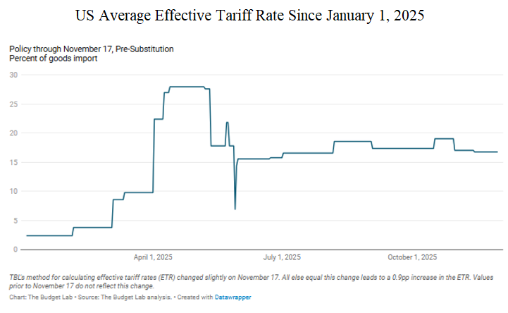 まず①の点については米国の実効輸入関税率の推移を計測する必要がある。米国エール大学のThe Budget Lab"State of U.S. Tariffs: Jan.17.2026"の算出によると図表1の通りであり、実効税率は25年5月に約28%に上昇した後、低下に転じ、同11月時点では約17%程度にとどまっている。2