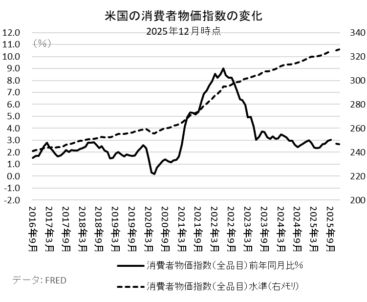 筆者自身も当初語られていた2つの関税引上げシナリオを前提に、消費者物価指数(全品目)は前年同月比で2%台から4.1%~4.5%へ上昇する予想した。1 筆者の予想よりずっと高い予測を公表するシンクタンクも多かったが、実際のインフレ率はほぼ2%後半で推移し、25年12月時点でも2.7%(前年同月比)と、FRBの目標である2%は上回ってるものの、3%を超えていない。