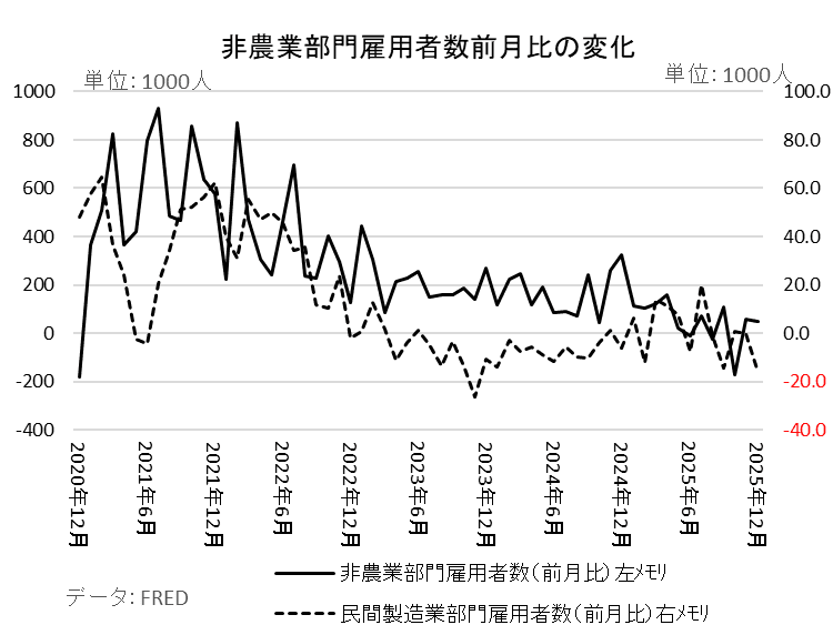 一方雇用動向に目を向けると(図表4)、AI投資ブームは広範な雇用を生むよりも、少なくとも短期・中期では大卒ホワイトカラーの職業を中心に雇用を削減し、「ジョブロス景気」の様相を呈している。また輸入関税引き上げで期待される製造業の雇用は、新型コロナショックからの回復での反動増が終了してからは、ほぼ横ばいにとどまっている。