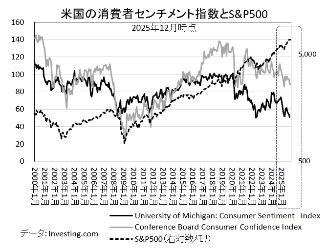 ところが2025年では株価が堅調な推移を辿る一方で、消費者のセンチメントが低下するという従来の逆の関係に転換している。