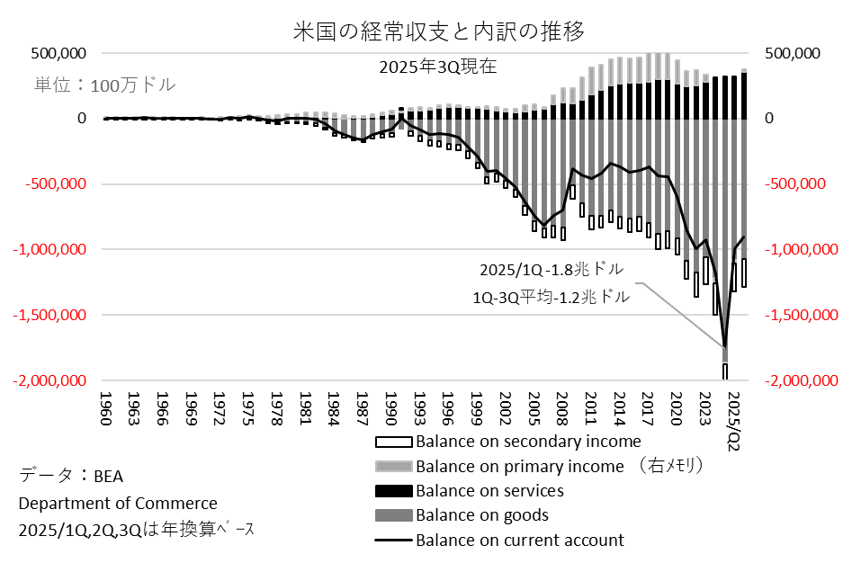 次にトランプ政権が重視している米国の貿易赤字、対外不均衡の動向に目を向けてみよう。図表6が示す通り、25年第1四半期に関税引き上げ前の過去込み輸入で貿易収支赤字(マイナス値は赤字)が急拡大した後、第2四半期はその反動で赤字は急減した。赤字減少は第3四半期も続いているが、これがどこまで第1四半期の反動で、どこまでが定着する傾向か、見極めるまでもう少し時間が必要だろう。