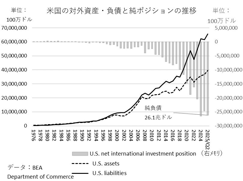 しかしながら貿易、経常収支赤字の長期にわたる結果として米国の対外純負債(対外資産と負債の差額)が対GDP比率で拡大・発散過程を辿っていることについては、これまで多くの経済学者が「長期的に持続不可能」と警鐘を唱えてきた。それでも結果として長期にわたって持続してきた。しかもこの問題は、国際金融論の分野ではドルの基軸通貨の地位の持続性とも絡んで論じられてきた。