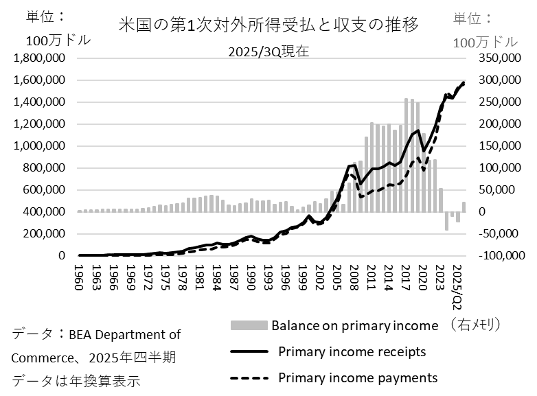 その正のリターン格差は現在も維持されているものの、GDP比率で90%にも及ぶ対外純負債の拡大の結果、正のリターン・ギャップでは所得収支の黒字を維持できなくなり、赤字に転じた。トランプ政権は「米国への輸出よりも米国での生産(直接投資)を」というスタンスで主要国との交渉に臨んでいるが、それには対外所得収支の赤字増加を結果する側面もあることに注意しておくべきだろう。