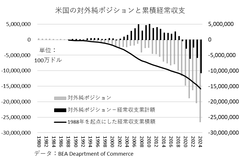 ところが米国の対外資産のうち外貨建て資産(株式、債券、ローン、不動産等)は、その外貨建て価格の変化とドル相場の変化で変動する。一方で米国の対外負債の大そうはドル建てであるが、これも当然時価が変動する。この対外資産・負債の価格変動から生じる評価損益全体が米国にとってプラスならば、キャピタル・ゲインとなり、その分だけ時価評価された対外純負債の増加は経常収支赤字の累積より小さくなる。